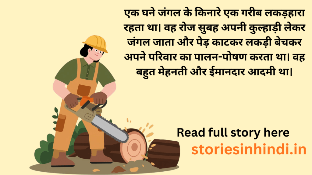 एक घने जंगल के किनारे एक गरीब लकड़हारा रहता था। वह रोज सुबह अपनी कुल्हाड़ी लेकर जंगल जाता और पेड़ काटकर लकड़ी बेचकर अपने परिवार का पालन-पोषण करता था। वह बहुत मेहनती और ईमानदार आदमी था।